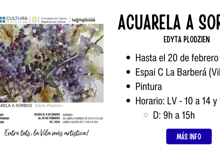 La artista Edyta Plodzien presenta en Villajoyosa su exposición Acuarela a Sorbos, una propuesta donde el color se saborea y la emoción fluye como el vino. Sus acuarelas, ligeras y transparentes, capturan instantes de luz y naturaleza con la delicadeza de un trazo que respira. Con la colaboración de Marichel López (Wineandtwits), la muestra celebra la conexión entre arte, vino y vida mediterránea. En la inauguración, la pintura se unirá a la música, creando una experiencia sensorial completa en la que los asistentes podrán brindar con vino y dejarse llevar por los matices del color, el sonido y la emoción compartida. Un canto a la belleza que se disfruta a sorbos.