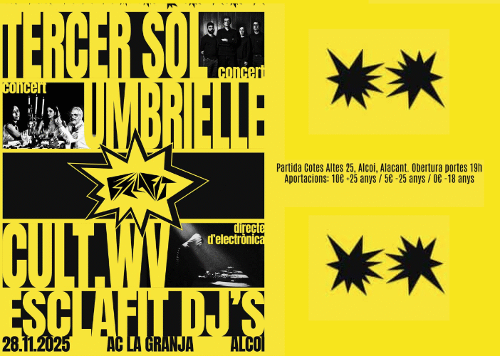 La escena independiente valenciana vivirá una de sus noches más potentes del año con un cartel explosivo en AC La Granja (Partida Cotes Altes 25, Alcoi). Tres propuestas de alto voltaje —Tercer Sol, Umbrielle y Cult.WV, junto a una sesión especial de Esclafit DJ’s— convertirán el espacio en un epicentro de oscuridad, electrónica y distorsión. El próximo viernes, 28 de noviembre, las puertas abrirán a las 19:00h para una velada que promete intensidad de principio a fin.