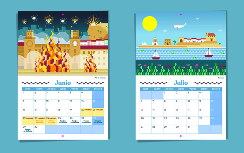 Llega el verano y con ello el mes de junio y les Fogueres. En este caso se decidió representar unos de los momentos más queridos por las alicantinas y los alicantinos, la nit de la cremà en el Ayuntamiento, justo a las 12 de la noche cuando se enciende la gran palmera desde el castillo. El resto de meses de verano se hizo hincapié en nuestras costas con la Isla de Tabarca o la Playa de San Juan y el Cabo de las Huertas.