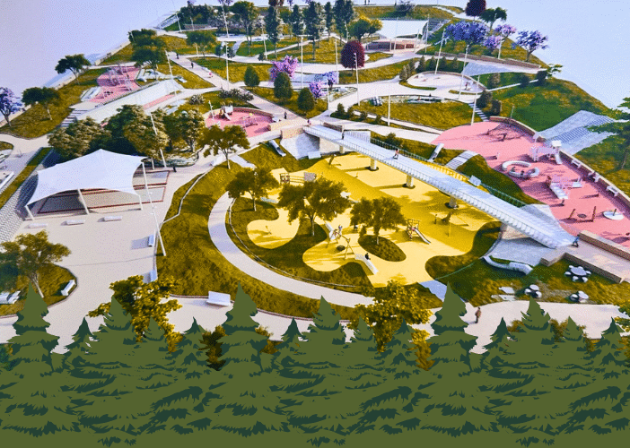 La nueva zona verde tendrá tres zonas de juegos infantiles que incluyen juegos inclusivos, como pasarelas para personas con movilidad reducida, paneles táctiles y sonoros y columpios adaptados. También contará con una tirolina de 28 metros de longitud y con nueve toboganes ubicados en las laderas que separan las terrazas del parque, generando un itinerario alternativo especialmente diseñado para los más pequeños. Estos toboganes conectan el mirador superior con el foso de grava redondeada en el que se encuentra la tirolina, ofreciendo una experiencia lúdica que enriquece el recorrido del parque y proporciona una transición divertida entre los distintos niveles del terreno.