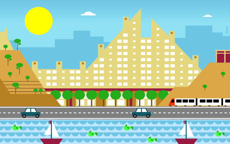 A partir de aquí desarrollé más ilustraciones como la isla de Tabarca o Santa Faz. Pero también me he atrevido con construcciones reconocibles, pero más conflictivas, como el edificio “La Pirámide”. Esta es, por ejemplo, una de mis ilustraciones favoritas.