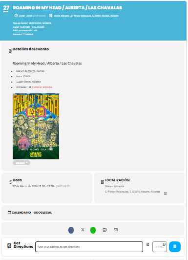 Y pulsando el evento que te interesa tienes toda la información que precisas: Cartel, las entradas, la sinopsis… y botones para compartirlo por redes, meterlo en tu calendario o enviarlo por e-mail