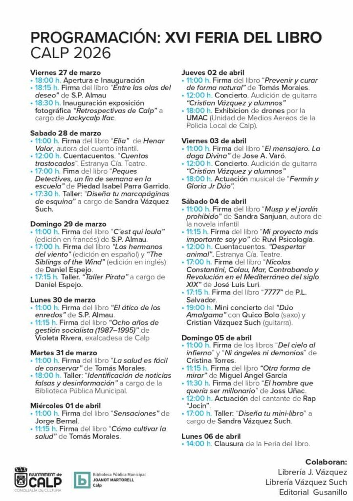 El municipio de Calp acoge desde este 27 de marzo una nueva edición de su Feria del Libro, que alcanza ya su decimosexta convocatoria consolidándose como una de las citas culturales más destacadas de la localidad.