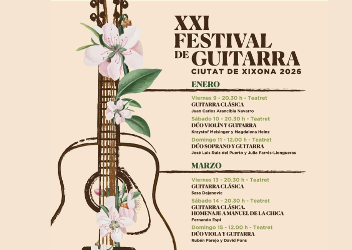El Festival de Guitarra Clásica de Xixona alcanza su vigésimo primera edición reafirmándose como una de las citas más sólidas del calendario guitarrístico en la Comunitat Valenciana. El certamen, que se desarrollará entre los meses de enero y marzo en el Teatret de Xixona, presenta una programación cuidada que combina recitales solistas, formaciones camerísticas y […]