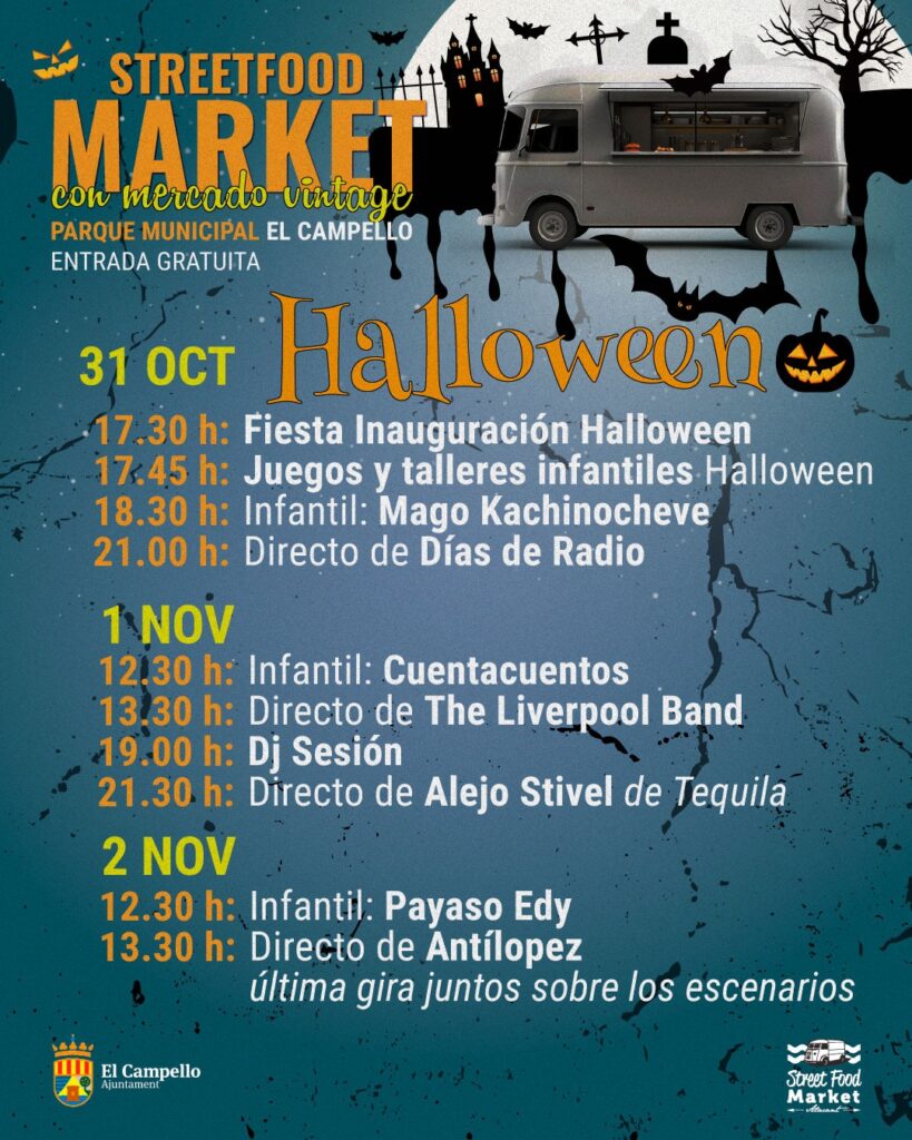 Del 31 de octubre al 2 de noviembre, el Parque Municipal de El Campello se convertirá en el epicentro de la creatividad y la diversión con la llegada del Street Food Market Halloween, un evento que reunirá música en directo, espectáculos, talleres y un mercado de diseño vintage, todo con acceso gratuito.