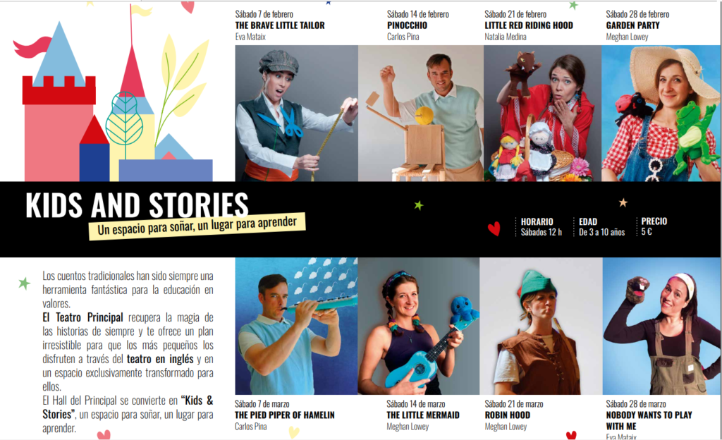 “KIDS & STORIES” EL PROYECTO DEL PRINCIPAL QUE PROPONE TEATRO EN INGLÉS PARA NIÑOS EN EL HALL DEL TEATRO. El Principal transforma el Hall del Teatro en un nuevo espacio de exhibición donde los niños puedan divertirse y aprender inglés. Los cuentos tradicionales han sido siempre una herramienta fantástica para la educación en valores y recupera la magia de las historias de siempre y ofrece un plan irresistible para que los más pequeños los disfruten a través de los cuentos en inglés y en un espacio exclusivamente transformado para ellos. El Hall del principal se convierte en “Kids & Stories”, un espacio para soñar, un lugar para aprender.