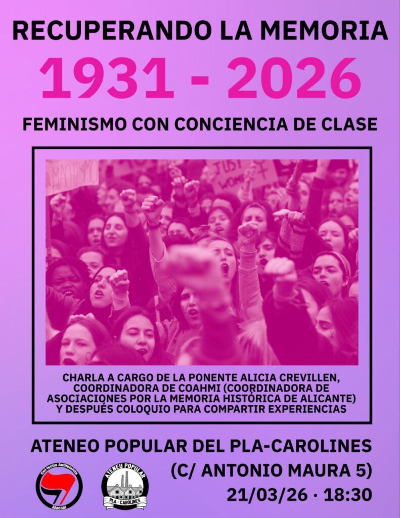 El Col•lectiu Antifeixista d'Alacant os invitamos a acudir a la charla "Recuperando la memoria 1931-2026 Feminismo con conciencia de clase"