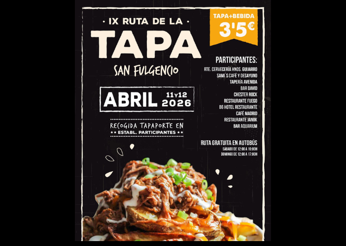 La IX Ruta de la Tapa de San Fulgencio invita a disfrutar de un fin de semana gastronómico con propuestas de bares y restaurantes locales. Los asistentes podrán recorrer distintos establecimientos degustando tapa y bebida a precio popular, además de participar en sorteos y premios. El evento contará también con servicio gratuito de autobús para facilitar el recorrido, convirtiéndose en una cita ideal para descubrir sabores y compartir una experiencia culinaria en el municipio.