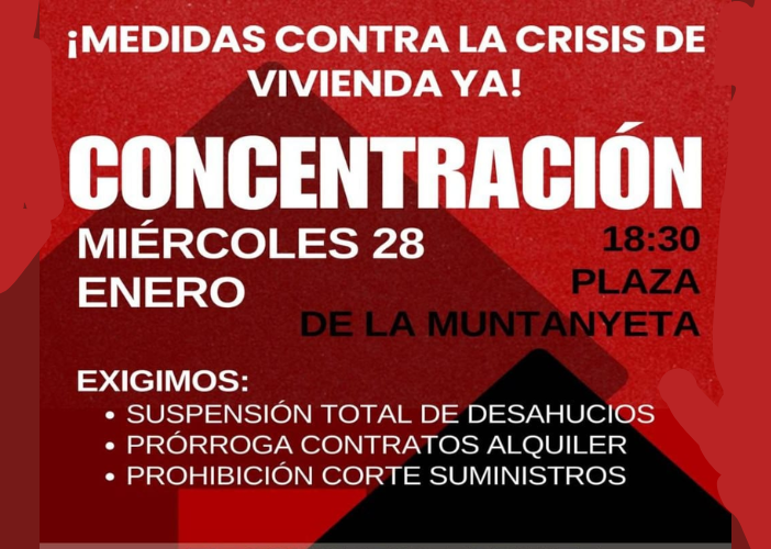 Hoy, 28 de enero, a las 18:30 horas, la Plaça de la Muntanyeta será escenario de una concentración urgente convocada por el Sindicat de Vivenda de Carolines y el Sindicat de Vivenda de Zona Nord para denunciar la derogación de la moratoria antidesahucios y la prohibición de cortes de suministros a familias vulnerables, así como la absoluta inacción de las instituciones ante una emergencia habitacional cada vez más grave.