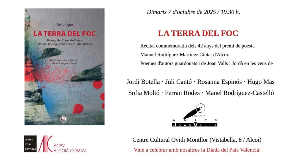 Martes 7 20.00 h – Centre Ovidi MontllorRecital de poemas de Joan VallsOrganiza: Associació d’Amics de Joan Valls