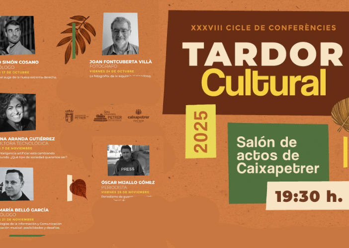Este viernes dará comienzo una nueva edición del Ciclo de Conferencias Tardor Cultural, que este año alcanza su vigésimo octava edición y vuelve a consolidarse como una de las citas culturales más esperadas en Petrer. A lo largo de los meses de octubre y noviembre, el ciclo reunirá a reconocidos expertos en distintas áreas del conocimiento, que ofrecerán charlas abiertas al público en el Salón de actos de la Obra Social Caixapetrer, siempre los viernes a las 19:30 horas.