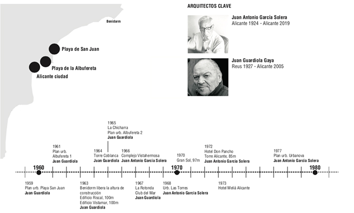 Temporalmente se ha delimitado el proyecto desde el año 1959 (cuando se diseña el plan urbanístico de la playa de San Juan) hasta mediados de los años 70, cuando se construyen los últimos edificios de este estilo. Habría que destacar las dos figuras principales de estos años; Juan Guardiola y Juan Antonio García Solera, dos jóvenes arquitectos que importaron las características y los materiales del Estilo Internacional, como el hormigón, el acero o el vidrio y las adaptaron a la realidad y necesidades locales. Son los encargados de la urbanización de las nuevas zonas de turismo y firman el diseño de las principales construcciones. Juan Guardiola es, por ejemplo, el arquitecto que diseña la Torre Coblanca, el primer rascacielos construido en Benidorm en los primeros años 60.