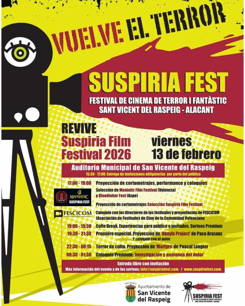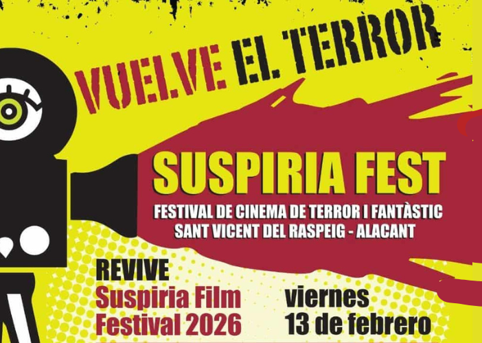 Tras siete años de ausencia, el Suspiria Film Festival regresa a San Vicente del Raspeig con una jornada especial de relanzamiento que tendrá lugar el viernes 13 de febrero en el Auditorio municipal. Bajo el nombre Revive Suspiria, el certamen marca el inicio de una nueva etapa para uno de los festivales españoles más reconocidos dedicados al cine de terror y fantástico, cuya séptima edición oficial se celebrará en noviembre de 2026.