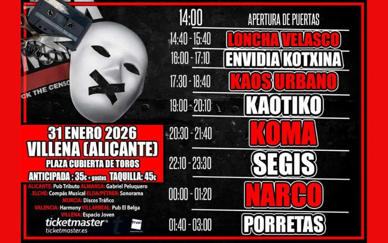 La ciudad de Villena se convertirá este sábado 31 de enero en uno de los grandes puntos de encuentro del rock estatal con la celebración del festival Fck the Cnsrshp, una intensa jornada musical que reunirá a algunas de las bandas más representativas del punk y el rock combativo en la Plaza Cubierta de Toros.